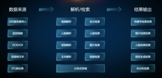 检索和输出:解决多模态检索和输出展示,支持关键字、图片、人脸、视频片段等多模态检索,支持按照模板生成报告、BI数据分析和展示等