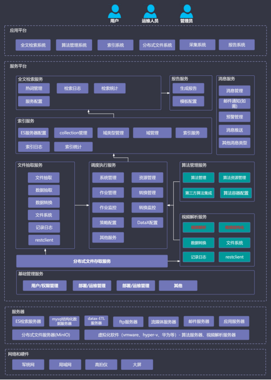 解析和存储:解决数据结构化和可检索,支持文档、图片、音频、视频、人脸等各类资料的结构化解析,通过AI算法,进行参数和模型训练,提供检索和生成服务